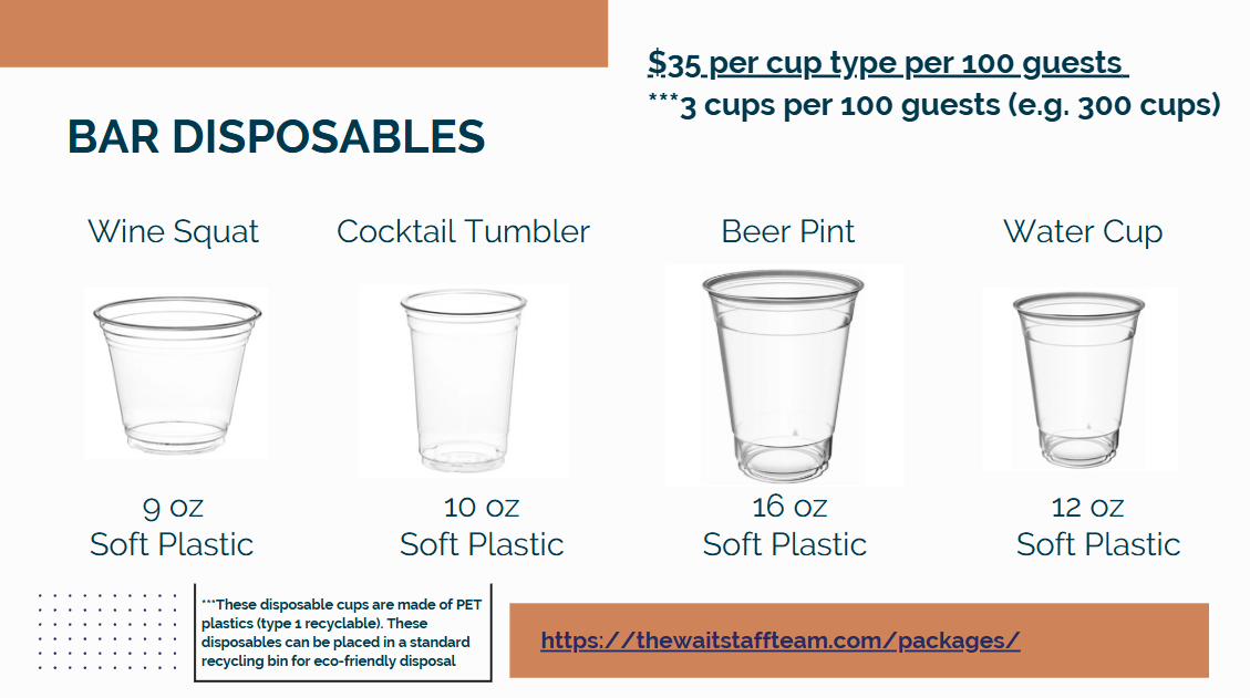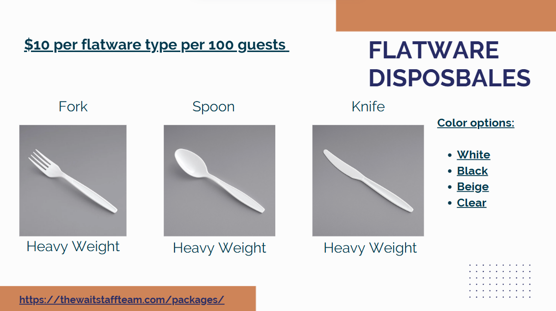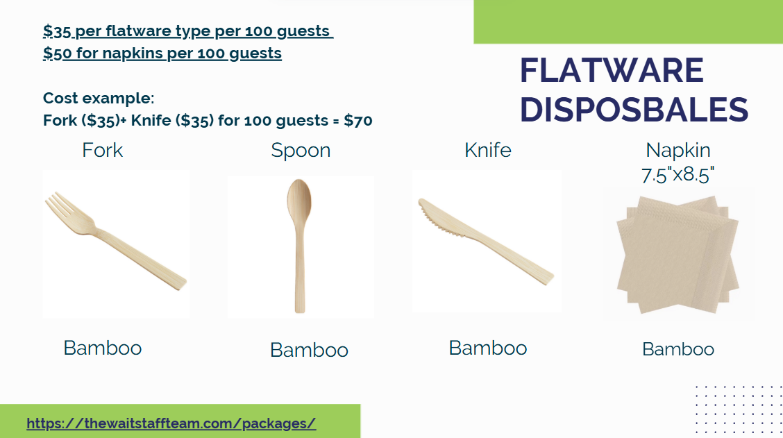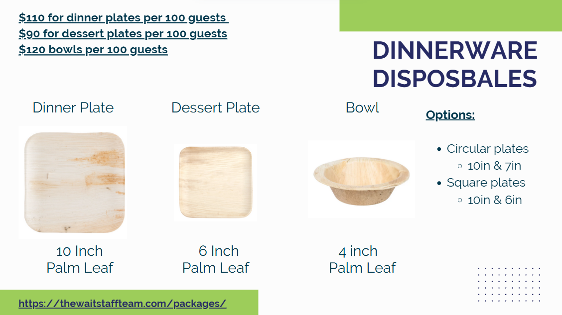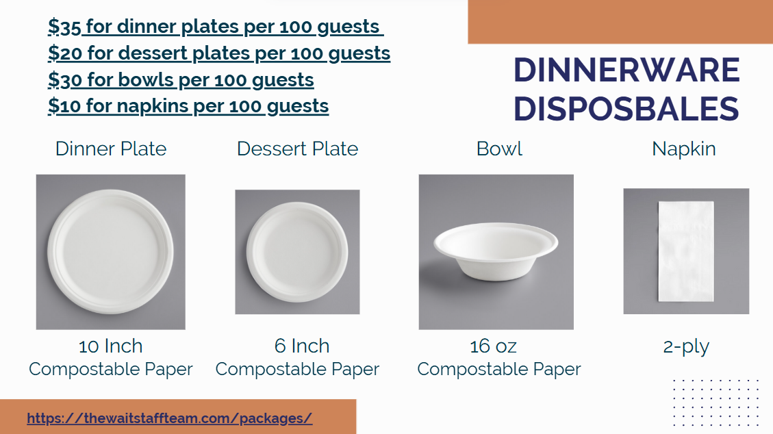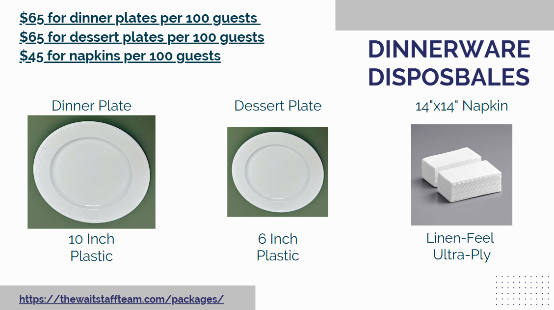 All disposables provided by TWST can be mixed and matched from different packages and tailored to your guests counts and your specific event needs.