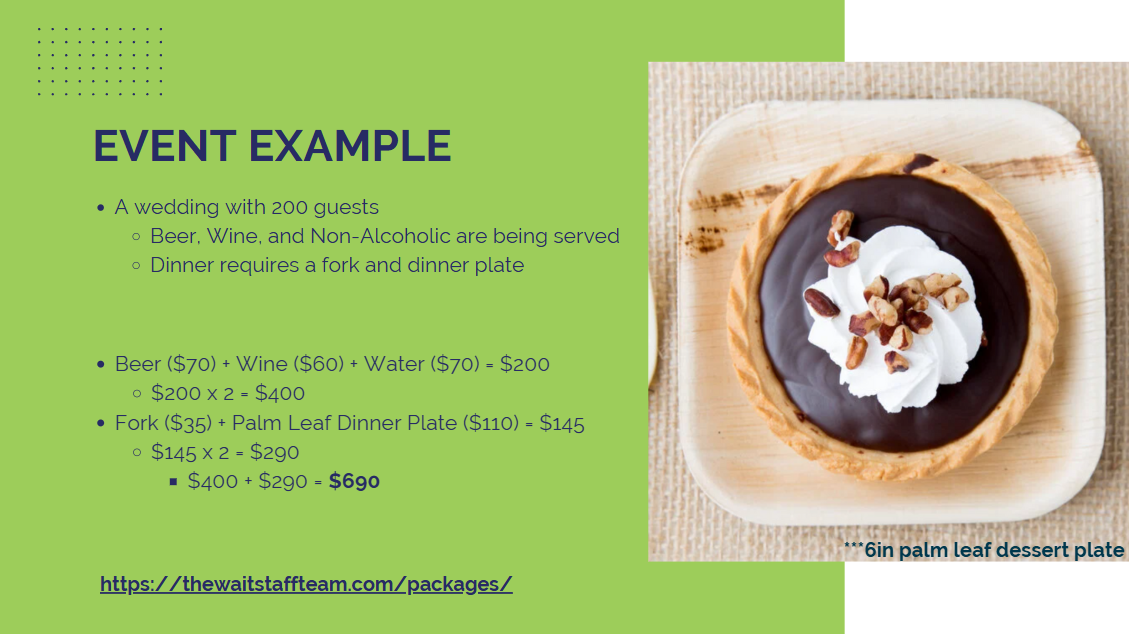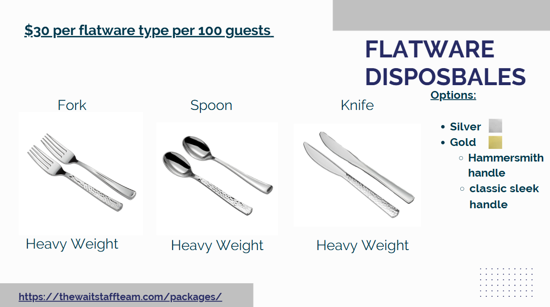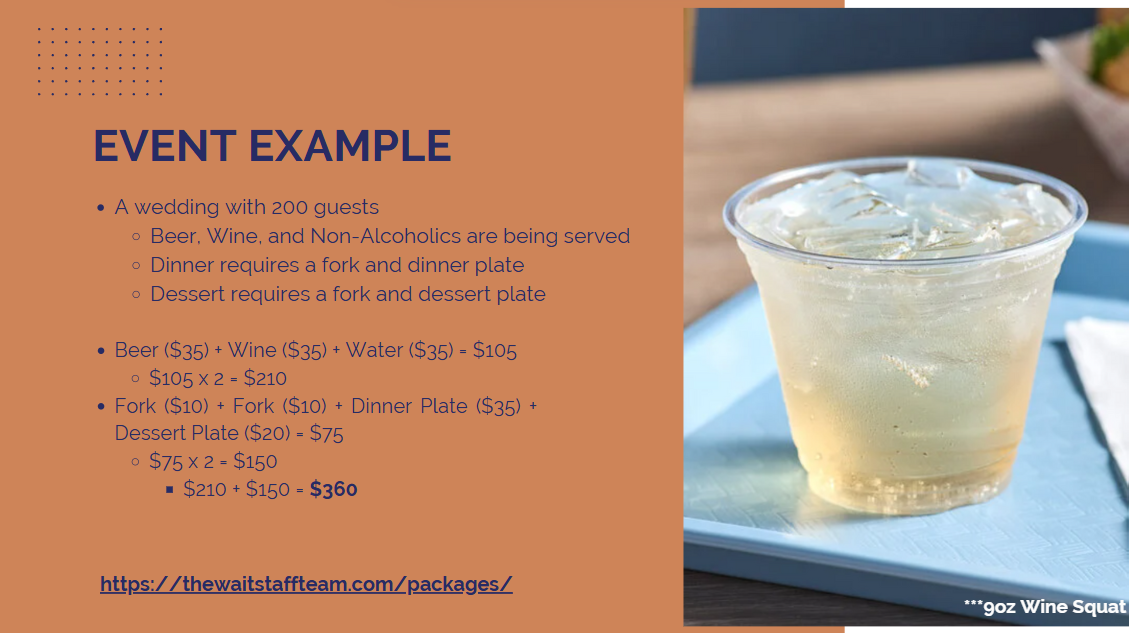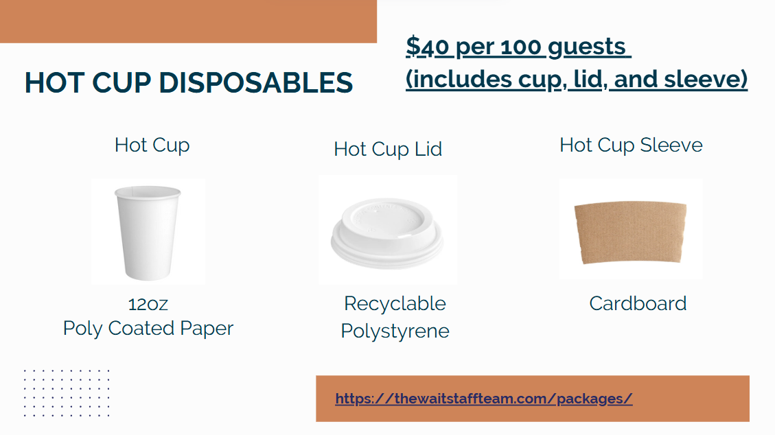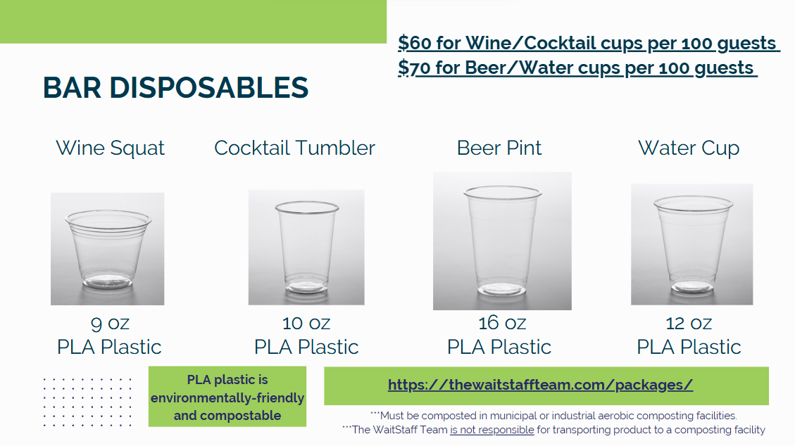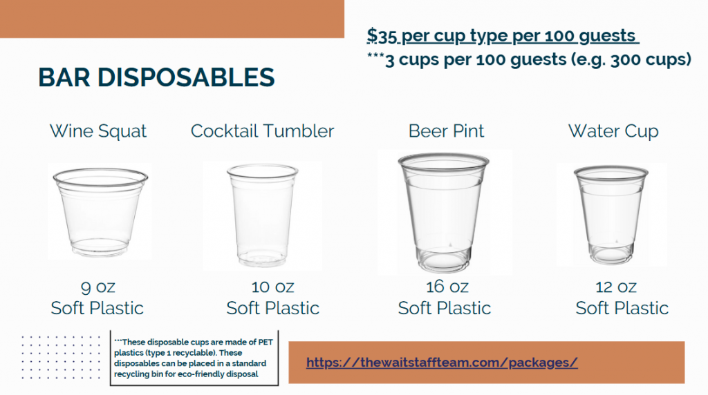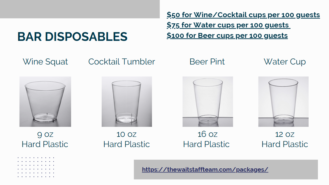 All disposables provided by TWST can be mixed and matched from different packages and tailored to your guests counts and your specific event needs.